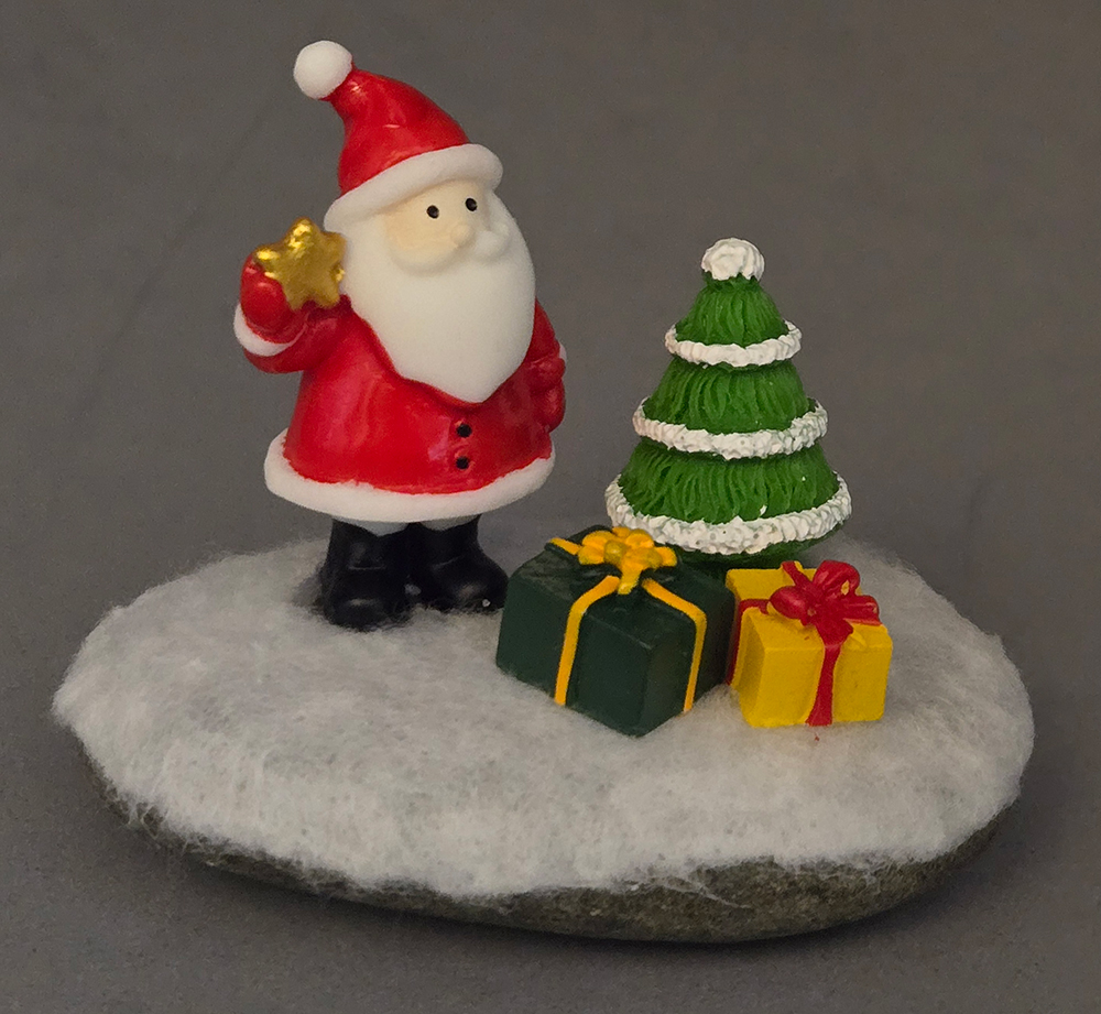 Gift the holiday spirit with this Christmas diorama! Built on a river rock foundation, this diorama has Santa, Christmas tree, and presents – all resin figurines, with cotton snow covering the river rock. Approximately 2.5″ x 3″ x 2.5″.